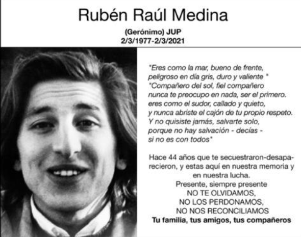 Compañero del sol, fiel compañero nunca te preocupo en nada, ser el primero. eres como el sudor, callado y quieto, y nunca abriste el cajón de tu propio respeto. Y no quisiste jamás, salvarte solo, porque no hay salvación – decías – si no es con todos» hace 44 años que te secuestraron- desaparecieron, y estas aquí en nuestra memoria y nuestra lucha.