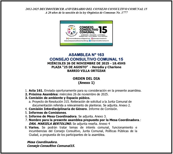 8. Varios. Se podrán tratar temas de interés comunal, funcionamiento e incumbencias del Consejo Consultivo, Junta Comunal, Políticas Públicas de la Ciudad, a propuesta de los participantes de la asamblea.