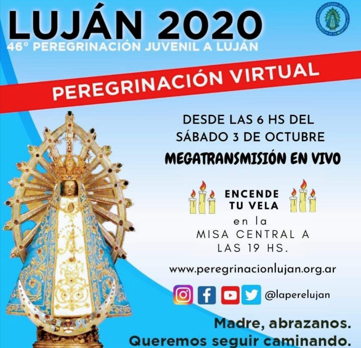 La 46ª edición de la Peregrinación Juvenil al Santuario de Luján, que se realiza este sábado bajo el lema «Virgen de Luján nos cuide a todos y nos de fuerza para seguir caminando», se puede seguir a través de las redes sociales.