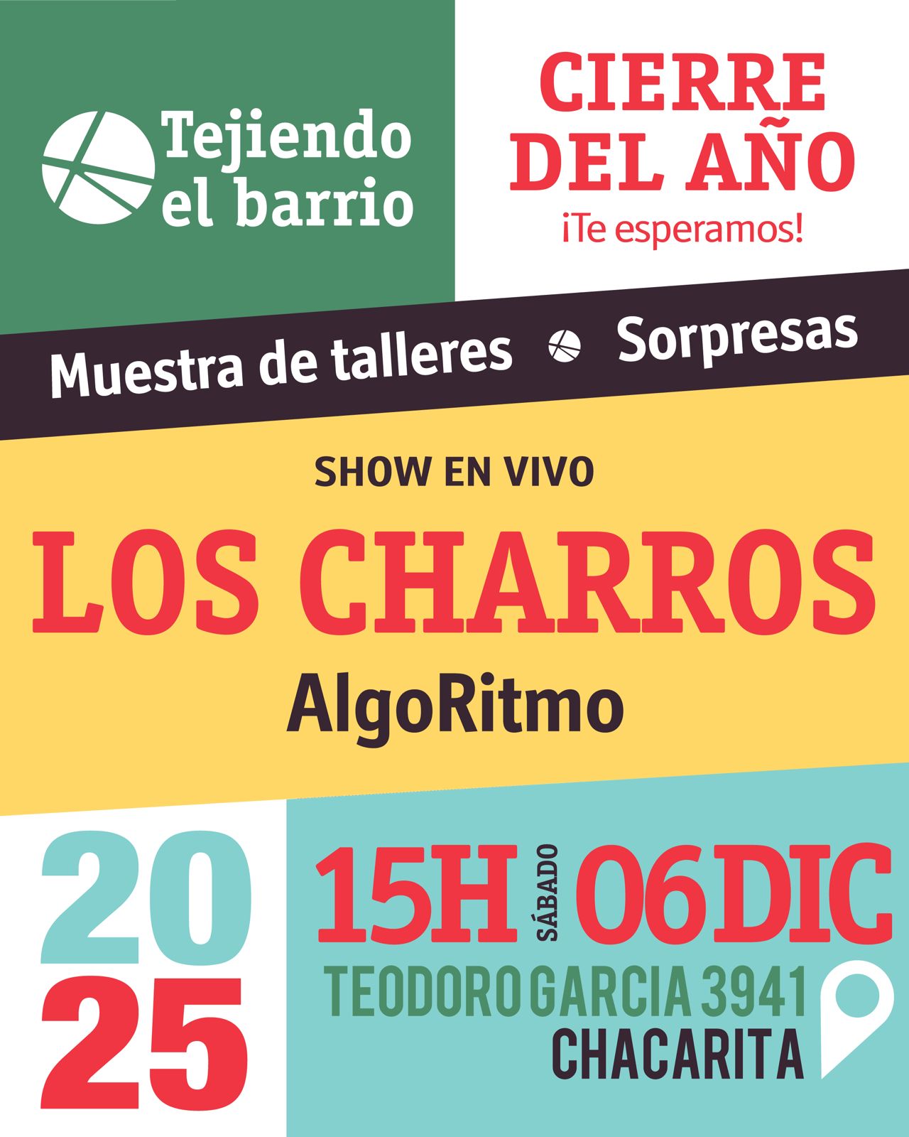 Desde Tejiendo el Barrio queremos invitarte al evento de cierre de año que realizaremos el próximo sábado 6/12 en nuestra sede de Teodoro Garcia 3941, Chacarita.