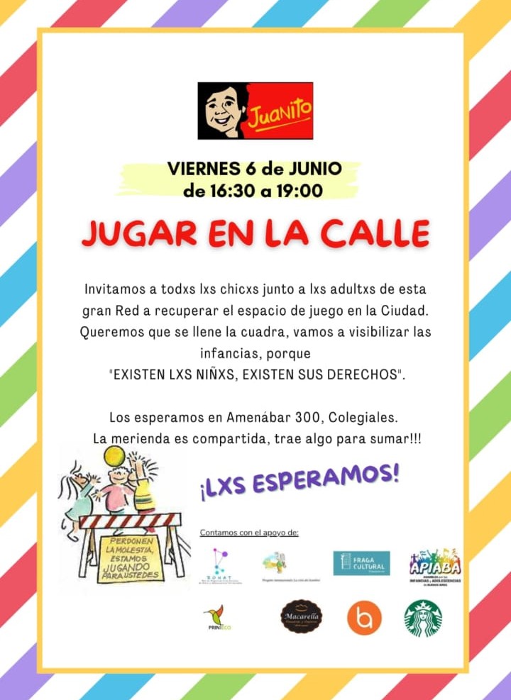 Nuevamente la Fundación Juanito invita a todos los vecinos, chicos acompañados de los adultos a jugar en la calle, para volver a disfrutar de jugar libremente. Sigamos construyendo una comunidad amorosa para todos. Amenabar al 300, casi esquina Jorge Newbery