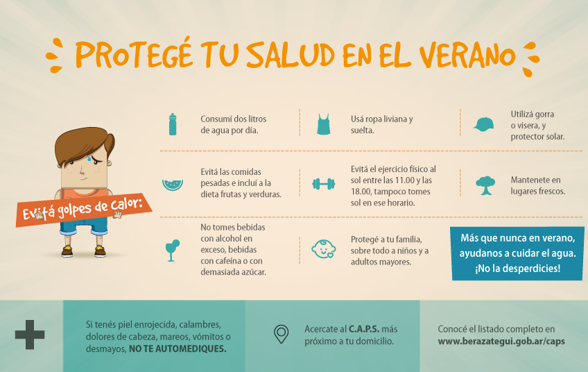 En los días de temperatura altas debemos prevenirnos, hay tomar mucha agua y no tomar bebidas alcohólicas y azucaradas, tratar de no salir en el horario de 10 a 17 hs, mantenerse en lugares frescos y con ventilación, comer frutas y verduras, evitar de comer en abundancia, tratar hacer menos actividad física, usar ropa liviana, clara y gorra o sombrero y anteojo de sol.