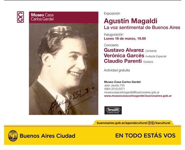 El 18 de marzo de 2013 a las 19 hs con entrada libre y gratuita en el Museo Casa Carlos Gardel ubicado en Jean Jaures 735, barrio del Abasto, se inaugura la exposición sobre LA VOZ SENTIMENTAL DE BUENOS AIRES que es decir, AGUSTIN MAGALDI nada menos.