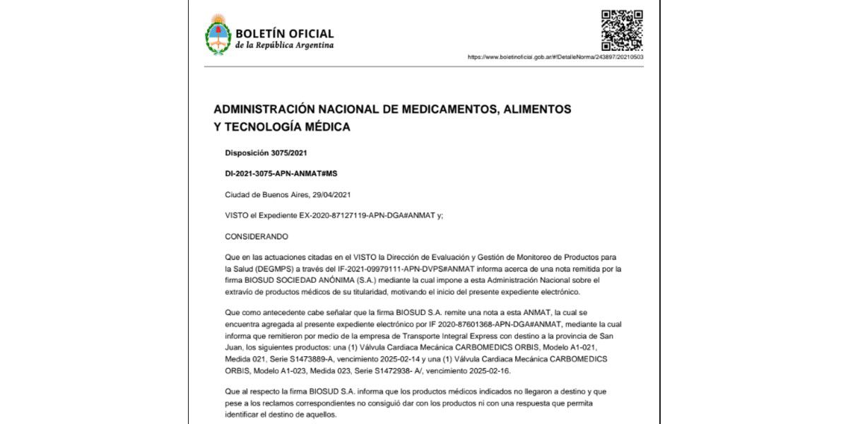 El Lunes se publicó a través de la disposición 3075/2021 en el Boletín Oficial, la Anmat informó el retiro del mercado de los productos con la siguiente información impresa en su estuche secundario: Válvula Cardiaca Mecánica CARBOMEDICS ORBIS, SIZE 21, REF A1-021, SN S1473889-A, Use by 2025-02-14. Y Válvula Cardiaca Mecánica CARBOMEDICS ORBIS, SIZE 023, REF A1-023, SN S1472938-A, Use by 2025-02-16.