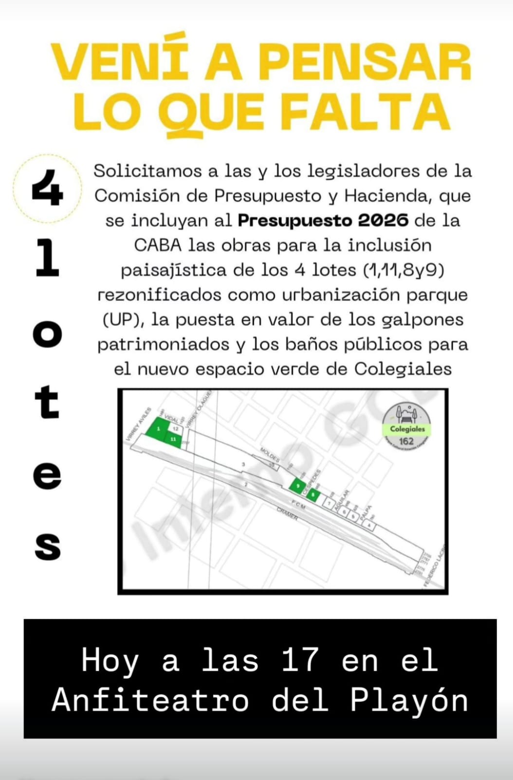 Los vecinos de Colegiales convocan a una asamblea abierta para organizar el pedido formal dirigido a los legisladores de la Comisión de Presupuesto y Hacienda. El objetivo es que se incluyan en el Presupuesto 2026 de la Ciudad las obras necesarias para la incorporación paisajística de los cuatro lotes (1, 11, 8 y 9) rezonificados como urbanización parque.