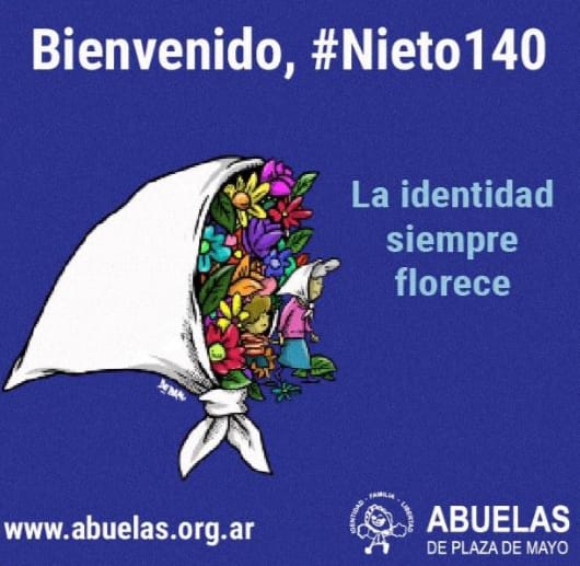 Este lunes, en la Casa por la Identidad de Abuelas de Plaza de Mayo, Estela de Carlotto, Presidenta de Madres de Plaza de Mayo, anunció la restitución del nieto 140. Con emoción, enfatizó: «Lo fundamental e importante de la nueva restitución para la lucha por la Memoria y la Identidad. […] Hay alguien que nos ayuda desde arriba, y que son nuestras queridas Madres que no están. Están los nietos al lado, dándonos la fuerza para seguir hasta esta edad que tengo yo… Todavía estoy lúcida y eso es felicidad».