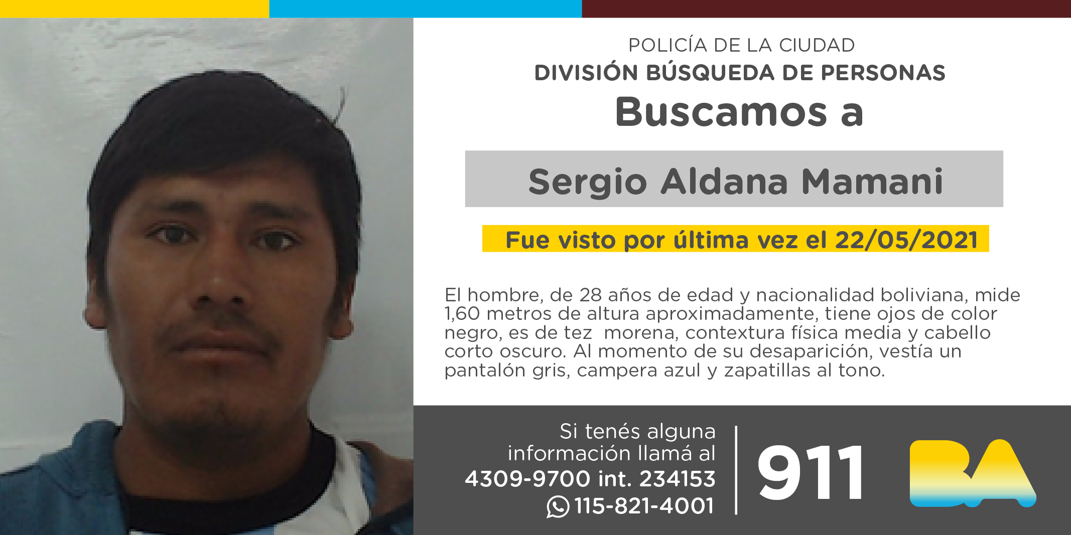 La Policía de la Ciudad solicita colaboración en la búsqueda de Sergio Aldana Mamani.