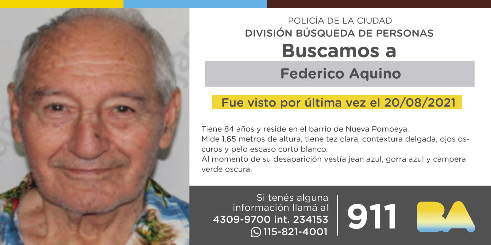 El hombre, de 84 años, reside en el barrio de Nueva Pompeya y se encuentra desaparecido desde el 20 de agosto.