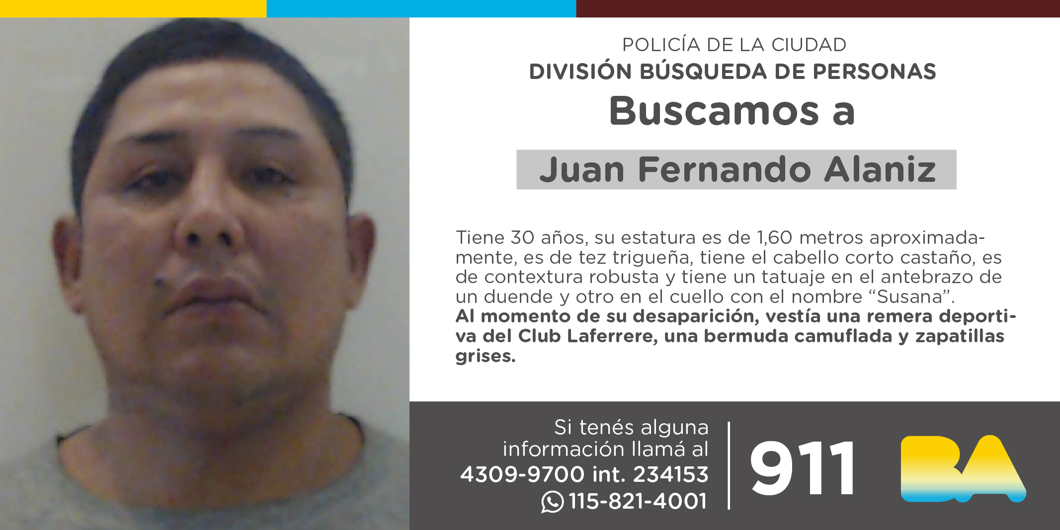 La Policía de la Ciudad solicita colaboración en la búsqueda de Juan Fernando Alaniz.