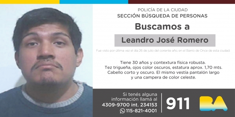 |Paradero| Búsqueda de persona La Policía de la Ciudad solicita colaboración en la búsqueda de Leandro José Romero. Romero, de 30 años de edad, se encuentra desaparecido desde el 26 de julio de este año y fue visto por última vez en la zona de la Plaza Miserere. Mide 1.70 aproximadamente, es de contextura física robusta, de tez trigueña, ojos marrones y cabello corto de color negro. Al momento de su desaparición vestía pantalón largo y una campera color celeste. Se solicita a la población, en caso de contar con información sobre la persona buscada, contactarse de inmediato con el 911 o al 4309-9600 interno 234153 o por WhatsApp al 11-5821-4001.