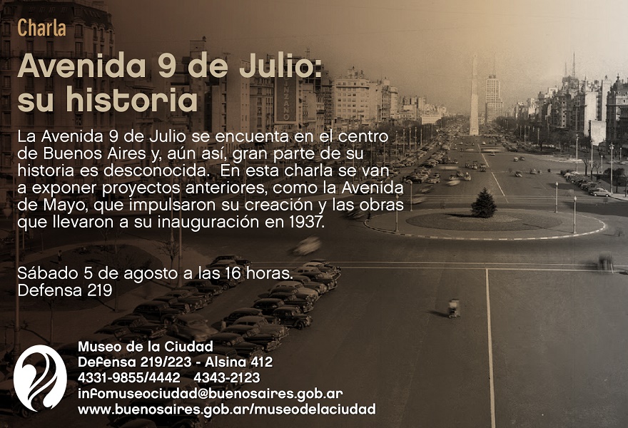 El Museo de la Ciudad, dependiente de la Dirección General de Patrimonio, Museos y Casco Histórico de la Ciudad de Buenos Aires, invita a disfrutar de la charla sobre la historia de la Avenida 9 de Julio, a cargo del Lic. Bruno Correia, el día sábado 5 de agosto a las 16 horas en la sede del Museo, ubicada en Defensa 219.