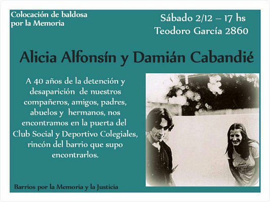Hoy, sábado 2 de diciembre a las 17hs, en el Club Colegiales (Teodoro García 2860), se va a colocar una baldosa por la memoria de Alicia Alfonsín y Damián Cabandié, padres del Diputado Nacional Juan Cabandié, a 40 años de su desaparición.