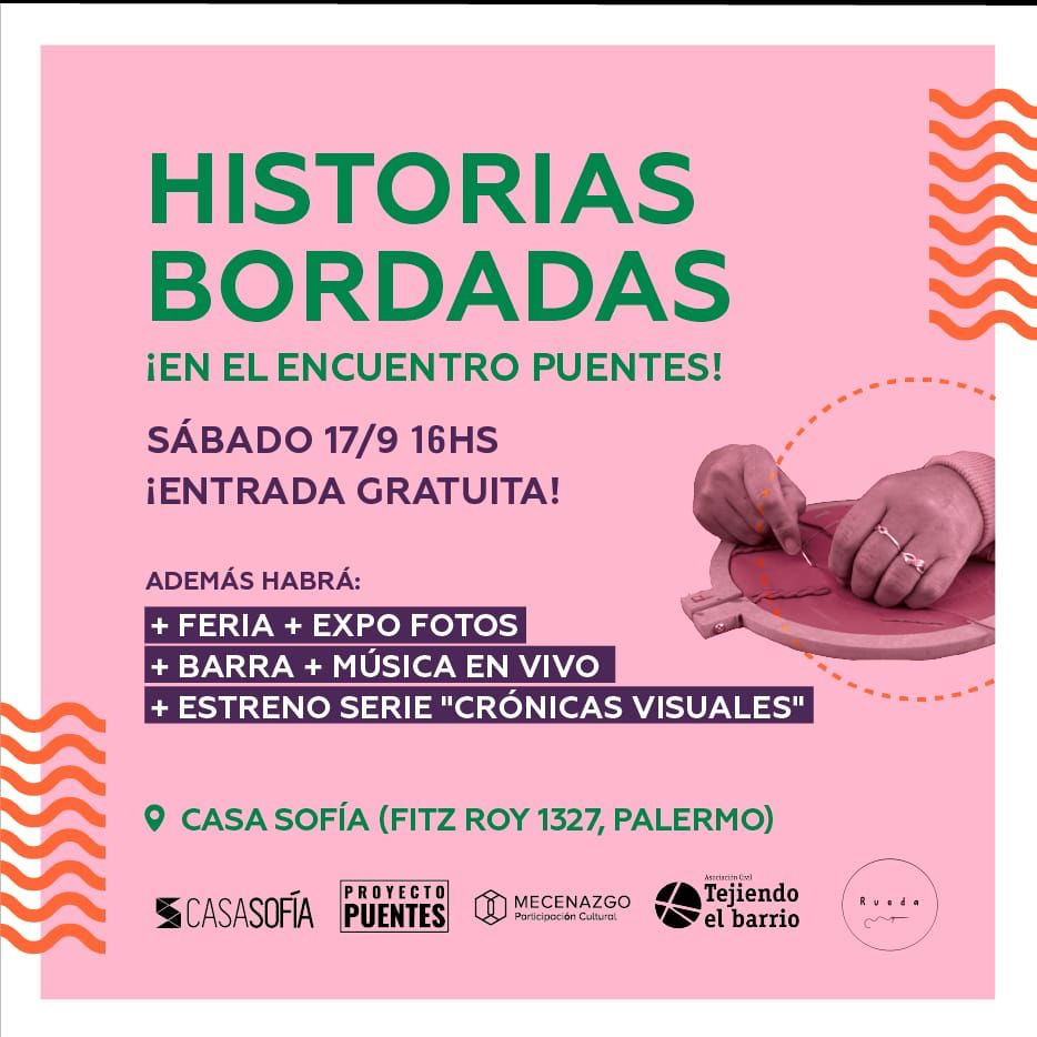 RUEDA DE BORDADO es un proyecto que reúne un grupo de alrededor de 15 mujeres en el playón de Chacarita todos los sábados desde el año 2020 (en forma virtual) y continua hasta hoy en el espacio de la asociación civil Tejiendo el barrio.El nombre del proyecto toma la rueda como un símbolo universal de movimiento: un eje permanece fijo y los radios que giran alrededor, hacen un recorrido, conectan y accionan hacia lo creativo.