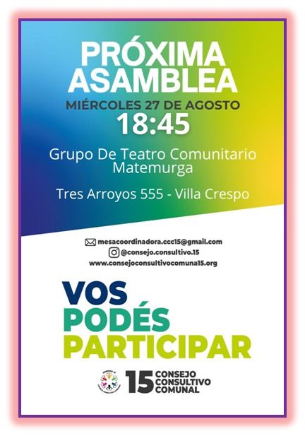 La próxima asamblea está programada para el miércoles 24 de septiembre en el barrio La Paternal.El Consejo Consultivo Comunal 15 cumple este año 13 años de funcionamiento, en el marco de los 20 años de la sanción de la Ley Orgánica de Comunas N° 1777.