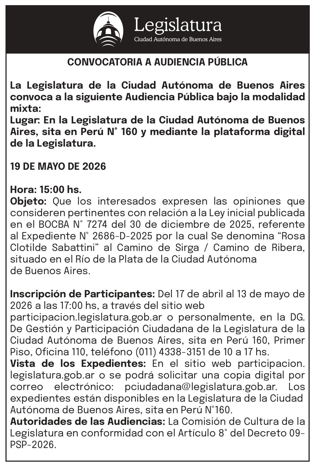 Objeto: Que los interesados expresen las opiniones que consideren pertinentes con relación a la Ley inicial publicada en el BOCBA N°7274 del 30 de diciembre del 2025, referente al expediente N 2686 – D- 2025 por la cuál se denomina «Rosa Clotilde Sabattini» al camino de Sirga / Camino de la Ribera, situado en el Río de la Plata de la Ciudad Autónoma de Buenos Aires.