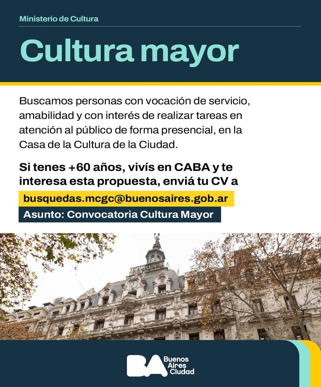 El Ministerio de Cultura de la Ciudad lanza una convocatoria dirigida a personas mayores de 60 años interesadas en realizar tareas de atención al público de forma presencial en la Casa de la Cultura.