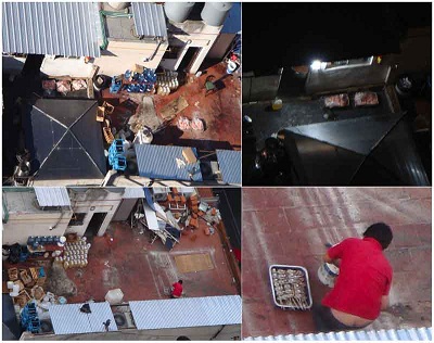 Las siguientes fotografías muestran cómo se prepara la comida que se vende en «comederos» del sector (llamamos «comederos» a locales de venta ilegal de comida hacia la vía pública). En una terraza, la comida queda a la intemperie, depositada en el piso, durante el día y la noche, expuesta a vectores (insectos, roedores, pájaros) y a sus excrementos. También se observa cómo la comida se prepara en el piso, al lado de suciedades y de basura.