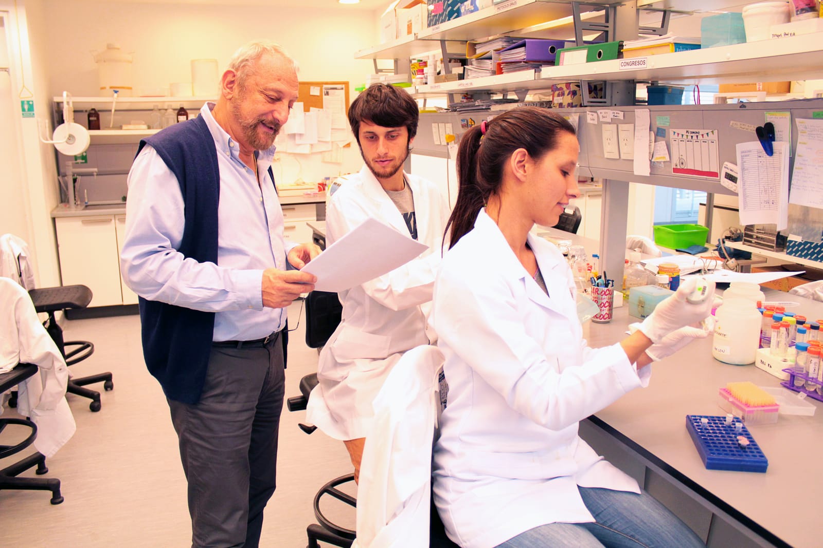 Eduardo Arzt junto a sus becarios David Golinski y Belén Elguero, en uno de los laboratorios del IBioBA CONICET- Instituto Partner de la Sociedad Max Planck. Fuente imagen: Prensa IBioBA.