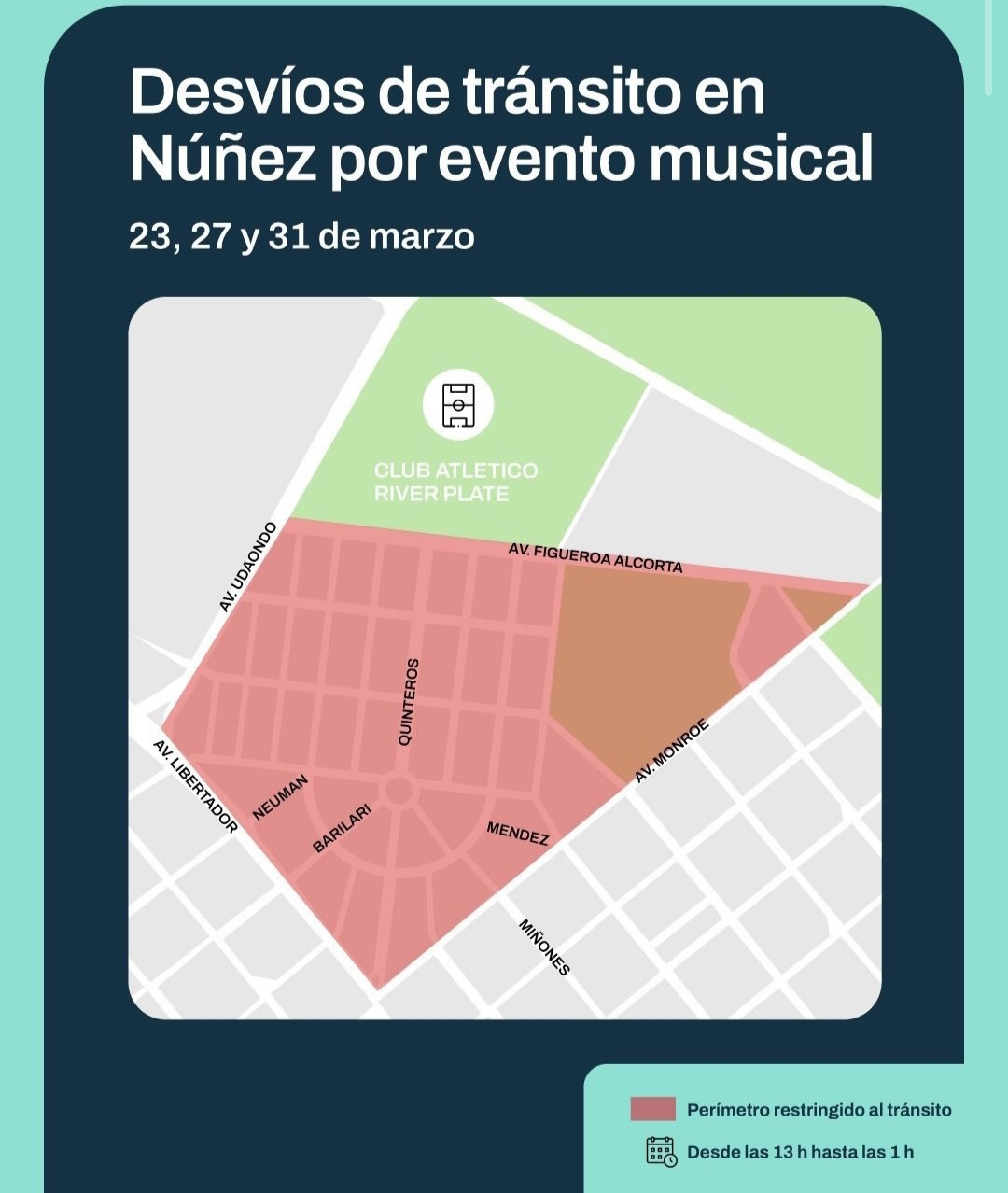 Los días 23, 27 y 31 de marzo habrá restricciones de circulación en el barrio de Núñez por eventos musicales en el estadio de River Plate. Si vivís o circulás por la zona, tomá nota de los cortes previstos.