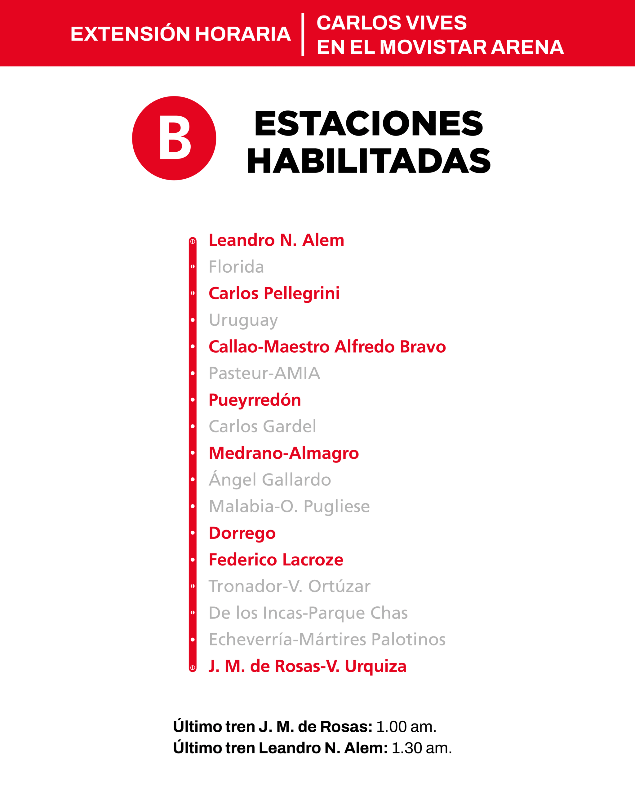 El miércoles 15, la Línea B funcionará hasta las 2 am a fin de facilitar la vuelta a casa tras el recital de Carlos Vives en el Movistar Arena. Además, viernes y sábado habrá servicio especial de la Línea H para facilitar la desconcentración de Guns N’ Roses en Huracán.