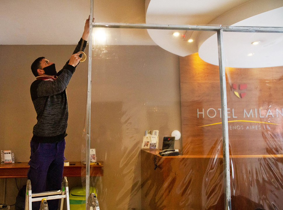 En la recepción del hotel, será necesario colocar un nylon o una mampara que servirá para separar el espacio donde se recibirá a los pacientes de forma segura. Los médicos y el personal del hotel permanecerán detrás de este separador. Allí los pacientes, una vez habilitado el hotel ingresan, se identifican, completan su ficha de admisión y suben a su habitación. El recorrido se repetirá en el momento del egreso.
