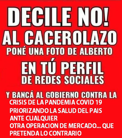 DEJEMOS GOBERNAR, NO ES EL MOMENTO DE GENERAR DISTURBIO Y CONFRONTACION EN NUESTRA SOCIEDAD.. ARGENTINOS ESTAMOS TRANSITANDO UNA PANDEMIA. ES EL MOMENTO DE CUIDARNOS ENTRE NOSOTROS Y UNIRNOS COMO PUEBLO PARA QUE ESTO PASE LO MAS PRONTO POSIBLE. DEJEMOS GOBERNAR AL PRESIDENTE QUE TRABAJA INCANSABLEMENTE PARA REDUCIR EL NUMERO DE CONTAGIOS EN NUESTRO PAIS APOYEMOS Y SEAMOS INTELIGENTES NO NOS DEJEMOS MANIPULAR POR LOS GRANDES EMPRESARIOS Y OPOSITORES QUE LO UNICO QUE LES IMPORTA GENERAR LA GRIETA EN ESTE MOMENTO.