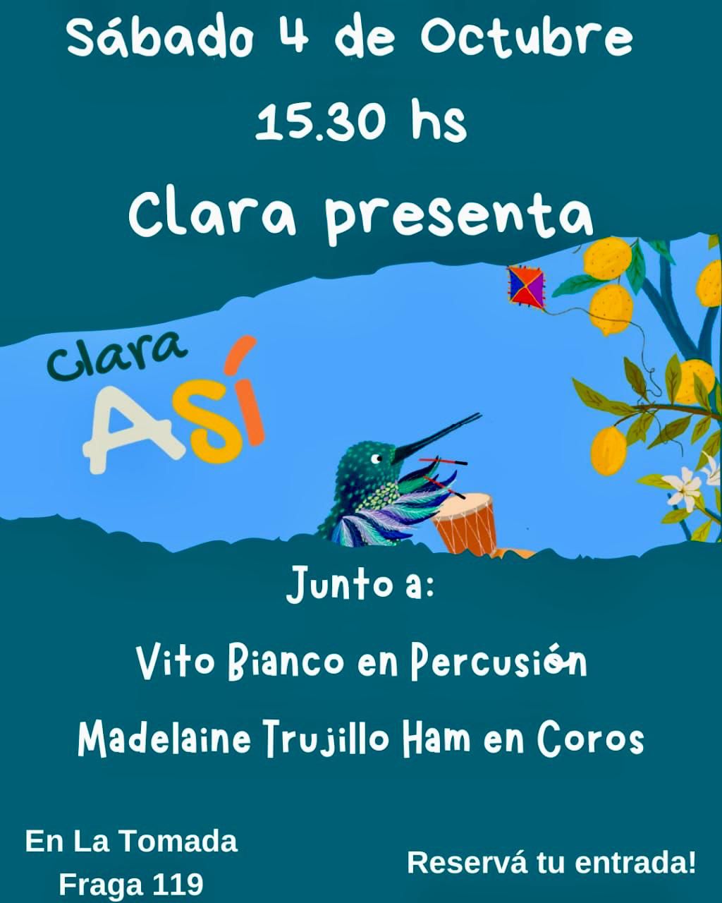 Clara (profe de música del jardín Abriendo Caminos) presenta su primer disco llamado ASÍ. $12.000 la entrada, los más peques gratis!