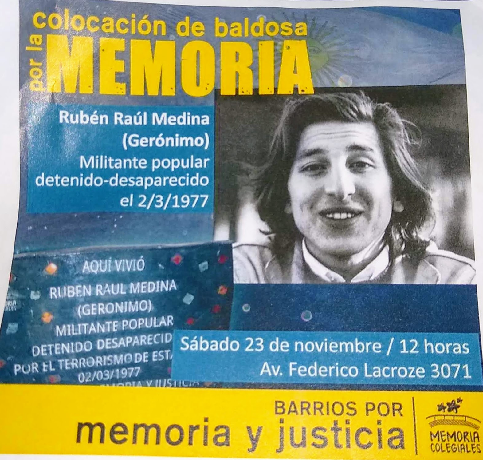 La Baldosa en Homenaje a Ruben Raul Medina, «Geronimo», «El Tordo» esta ubicada en la vereda de la Avenida Lacroze 3071, en el Barrio de Colegiales, donde actualmente esta La Fundacion Tiempo, aquí se observa una casona antigua, donde Geronimo vivió un tiempo con su Mamá y su hermana Zidi. Esta casa alberga los sentimientos mas profundo, de momentos compartidos de Geronimo junto a Zidi y su madre.