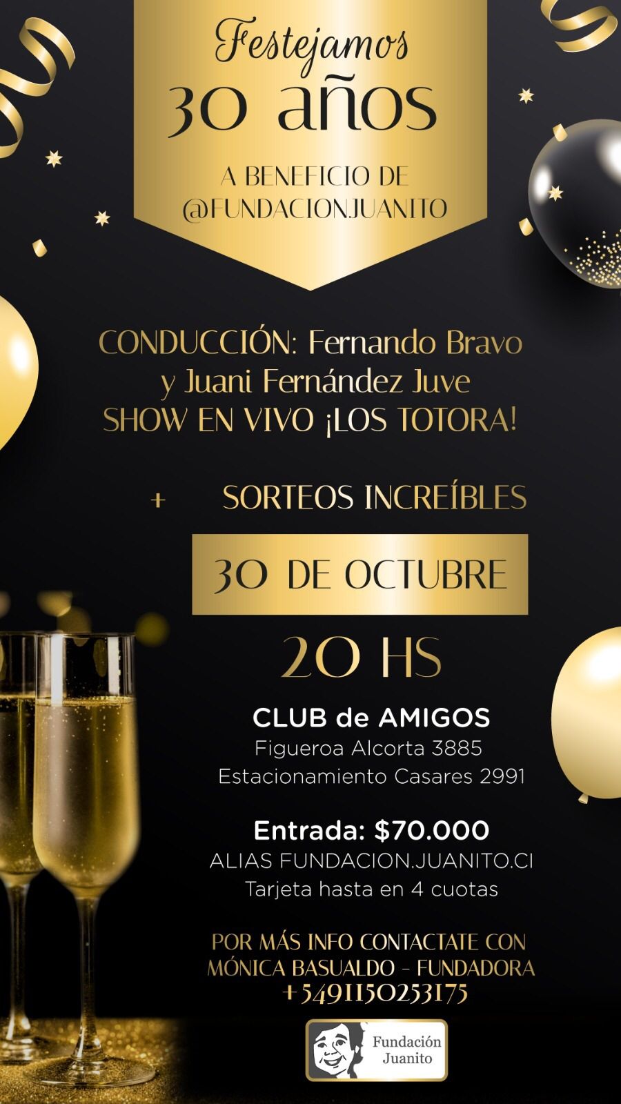 El próximo 30 de octubre a las 20 horas te esperamos en una celebración especial a beneficio de Fundación Juanito. La velada contará con la conducción de Fernando Bravo y Juani Fernández Juve, un show en vivo de Los Totora y sorteos increíbles.