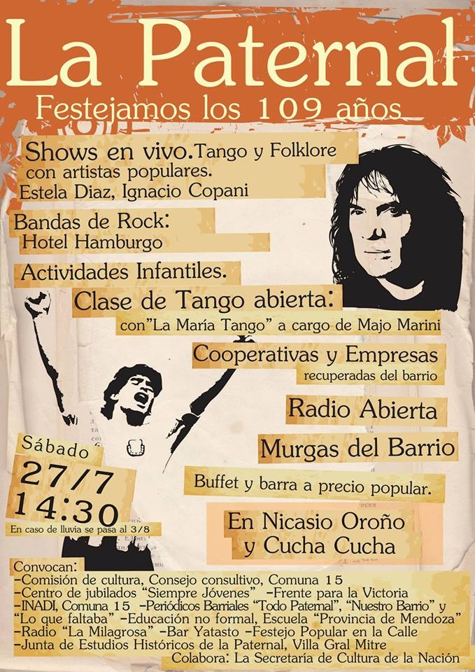CONVOCAN: Comisión de Cultura del Consejo Consultivo, Consejo Consultivo Comuna 15, Centro de Jubilado Siempre jóvenes, Frente para la Victoria, INADI, Junta Comunal 15, Periódicos barriales: «Todo Paternal”, «Nuestro barrio» y “Lo Que Faltaba”, Educación no formal Escuela Provincia de Mendoza, radio La Milagrosa, Bar Yatasto, Festejo Popular en la Calle, Junta de Estudios Históricos de La Paternal y Villa Gral. Mitre.