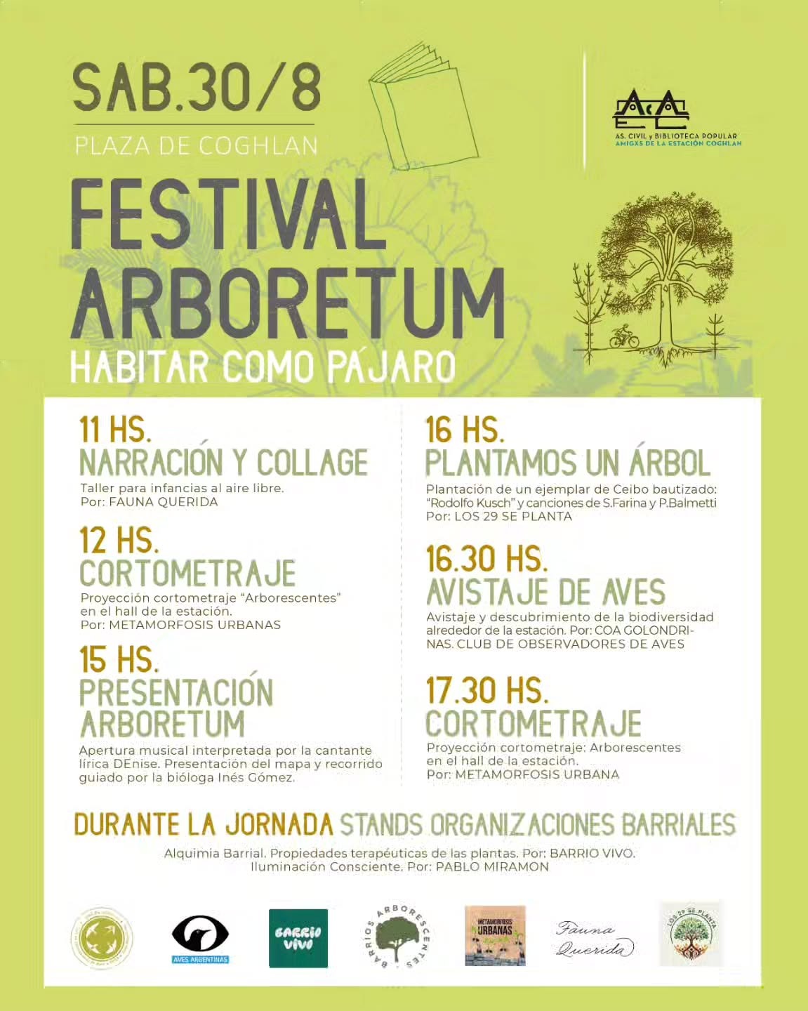 Una jornada dedicada a la conexión con el mundo natural llega a Coghlan de la mano del Festival Arboretum «Habitar como pájaro». El evento se realizará este sábado 30 de agosto de 11 a 18:30 horas en la Biblioteca Popular Estación Coghlan, ubicada en Estomba 2649, con entrada libre y gratuita.La propuesta combina actividades educativas, artísticas y de participación comunitaria diseñadas para explorar la importancia de los árboles y la vida silvestre urbana. El festival se suspende en caso de lluvia.