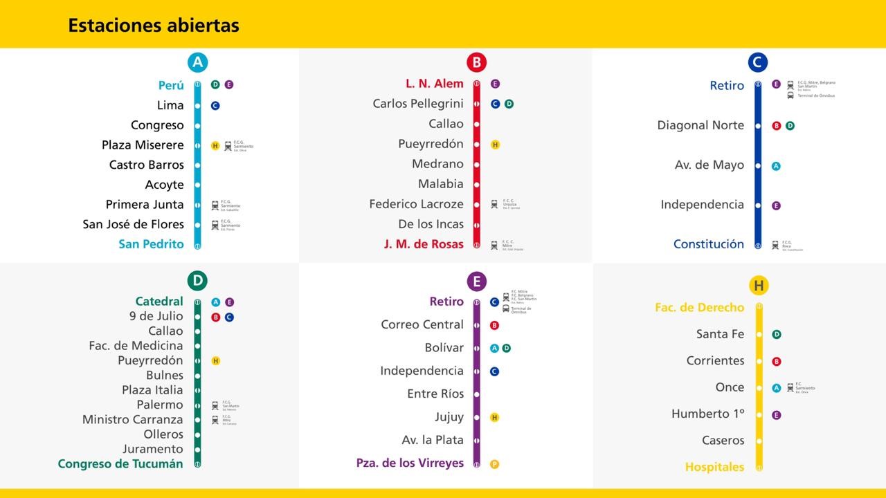 - Línea E: Retiro, Correo Central, Bolívar, Independencia, Entre Ríos, Jujuy, Av. La Plata y Plaza de los Virreyes.