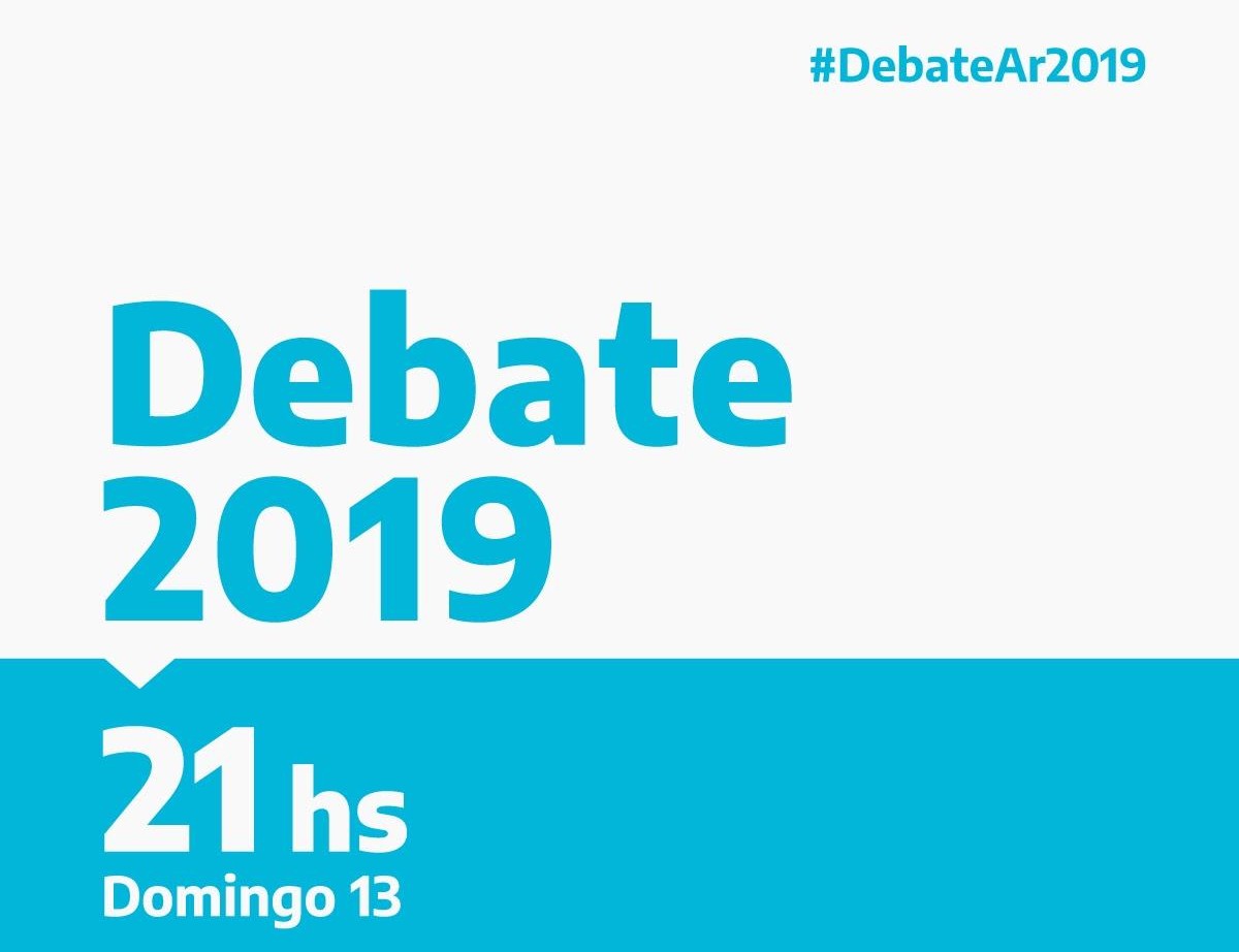 Este domingo 13 de octubre desde las 21hs. se realizara el primer debate entre los candidatos a Presidente durante las Elecciones Generales 2019. Mauricio Macri, Alberto Fernández, Roberto Lavagna, Nicolás del Caño, José Luis Gómez Centurión y José Luis Espert. Se llevaran a cabo en el Paraninfo de la Universidad Nacional del Litoral de Santa Fe. Se emitirá por TV pública. La segunda instancia será una semana después del domingo 20 de octubre, esta vez en la UBA. CABA.