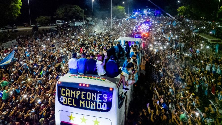 Ya rumbo al predio que tiene la AFA en Ezeiza, abriéndose paso iban patrulleros y motos, para custodiar al bus y proteger a los futbolistas campeones, nuestros muchachos. Ante la multitud que los esperaba desde la noche anterior. En medio de un furor colectivo La Scaloneta y sus integrantes cantaban el himno que generó este Mundial… «MUCHACHOOOSS», que La Mosca puso en boca de todos.
