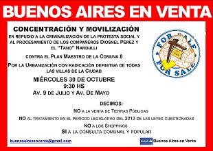 Convocamos a participar de la concentración y movilización impulsada por organizaciones de la Comuna 8 para este miércoles 30 de Octubre a las 9:30 hs enAv. 9 de Julio y Av. de Mayo para luego movilizar a Tribunales y a la Jefatura de Gobierno en repudio a la criminalización de la protesta social y al procesamiento de los compañeros Diosnel Pérez y el “Tano” Nardulli, contra el Plan Maestro de la Comuna 8 y por la Urbanizaciòn con radicación definitiva de todas las villas de la Ciudad.