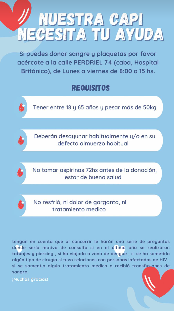 Si podes donar sangre y plaquetas por favor acércate al Hospital Britanico – Pedriel 74(CABA) de Lunes a Viernes de 08 a 15 hs.