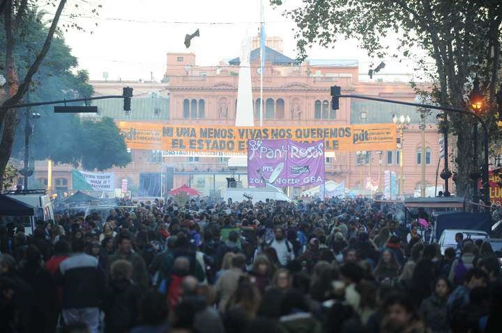 Las quince cuadras que separan el Congreso de la Plaza de Mayo estuvieron repletas, siempre, toda la tarde. A las cinco, la Plaza de Mayo estaba ocupada. Y hasta una enorme bandera de Ni Una Menos con dibujos y consignas colgaba del balcón del Cabildo. De fondo, se escuchaban a los Redondos, el sol iluminaba una casa de Gobierno llena de rejas pintadas con graffities. Un guía de turismo intentaba explicar el lío a un grupo de turistas de Bikking Buenos Aires.