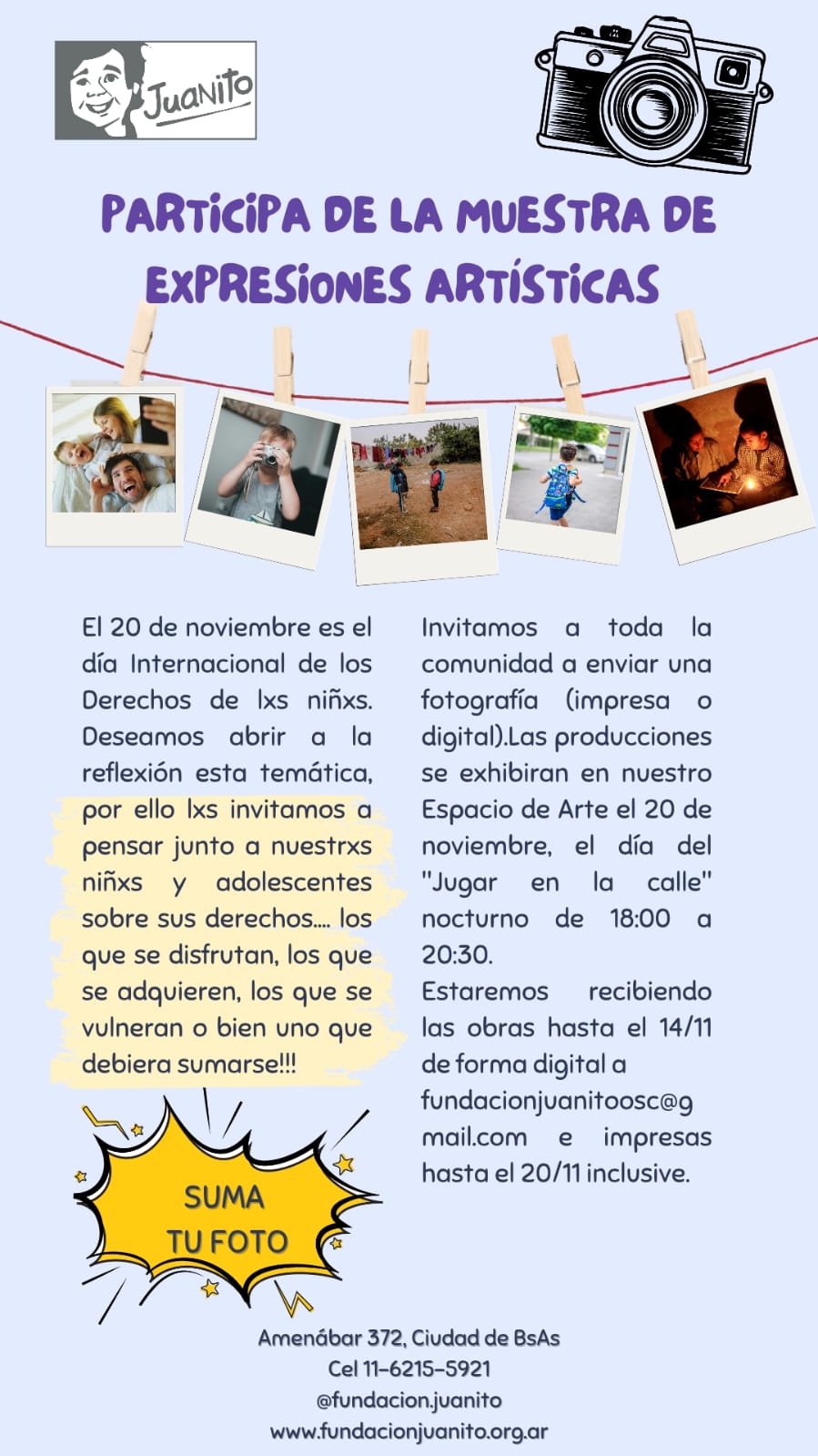 Compartimos esta invitación de Fundación Juanito para participar de una muestra fotográfica en el marco del Día de los Derechos del Niñx🎨 y un nuevo Jugar en la calle 🚲