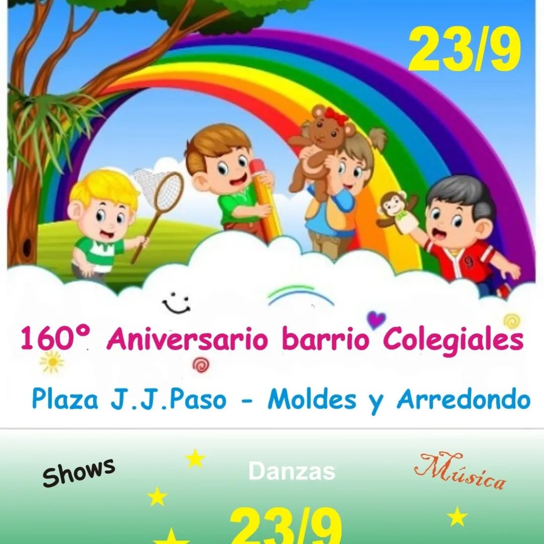 Celebremos el aniversario de nuestro barrio de Colegiales, Vení a festejar el Aniversario del barrio Colegiales, el 23/9, plaza Juan José Paso, Moldes y Arredondo. Como cada año Sera un día de Música, Danzas y Shows en vivo.