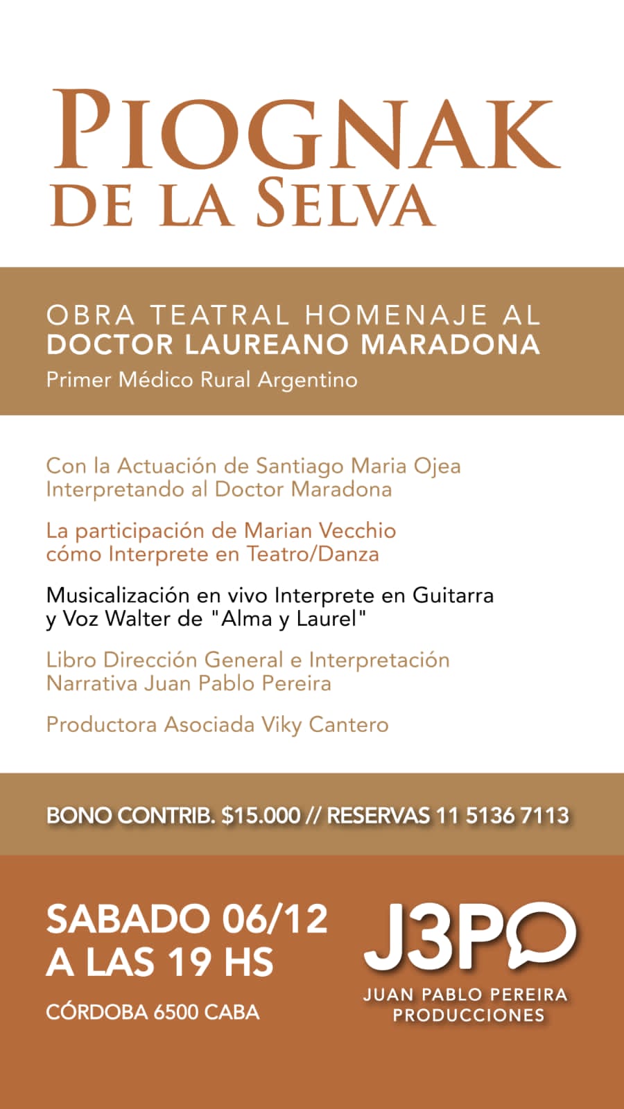 La compañía teatral Actrices y Actores en Movimiento presenta «Piognak de la Selva», una obra que recorre la vida y obra del doctor Laureano Maradona, pionero de la medicina rural en Argentina y figura fundamental en la historia del sanitarismo nacional.