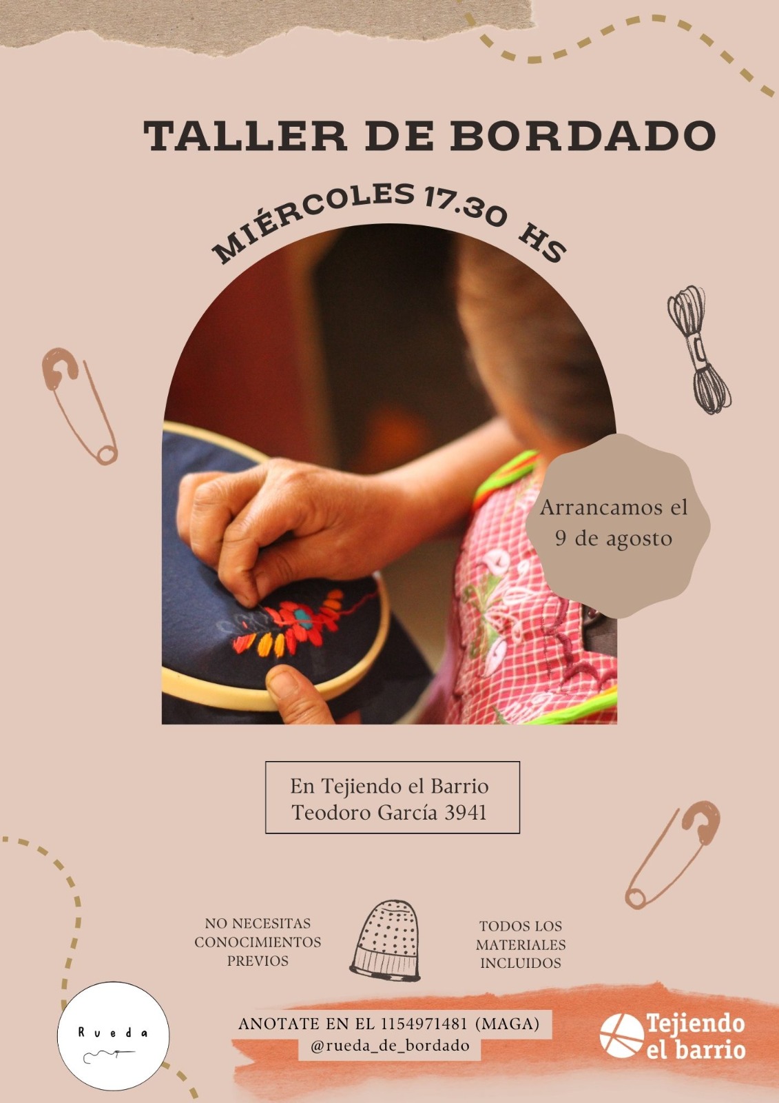 Esta es una invitación para un taller de bordado que *comienza en agosto* y es *gratuito* (incluye todos los materiales) en TEB.