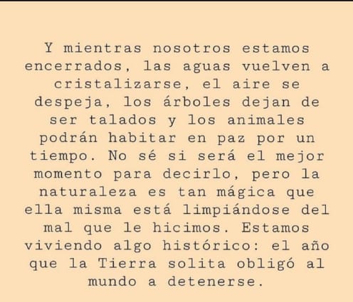 Creo que después de pasar esta Pandemia este Covid 19 muchas personas aprenderemos a vivir plenamente no postergando nuestros sueños, sabremos poner límites para no ser títeres de la vorágine social y del día a día, logrando reorganizarnos interiormente y estar centrados con nuestro Ser. Este virus que circunda nos hace ser más empáticos más conscientes del aquí y ahora de cómo queremos vivir de ahora en más porque cada uno de nosotros estamos al borde de la muerte… quizás ahora empezamos a vivir día a día.. proyectando una vida más sana física emocional y espiritualmente. Sólo aceptando vivir de manera equilibradas acordes a nuestro ser más supremo empezando a observar nuestro equilibrio entre lo mental emocional y ver en dónde debemos trabajar más para que así suceda… Podemos ser la diferencia como sociedad creo que podemos ser más conscientes hacia dónde vamos y como nos gustaría que sea en nuestras vidas. Sin lugar a duda me replanteo qué es lo que necesito cambiar para estar mejor emocionalmente… y si hay mucho para trabajar internamente y aprovechar estos días para conectar con nuestra alma y nuestro Ser ♀