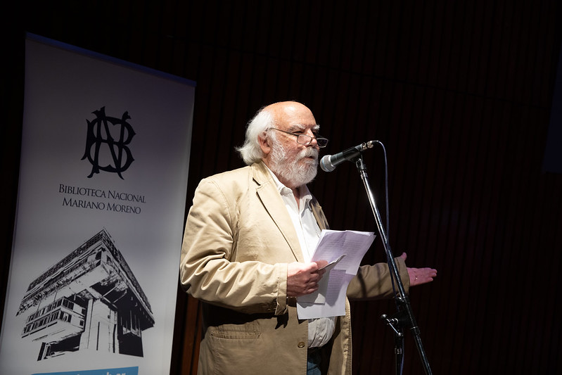 El director de la Biblioteca Nacional Juan Sasturain con Carlos Bernatek y Guillermo David, fueron los que mostraron el recorrido de cada uno de los premiados.
