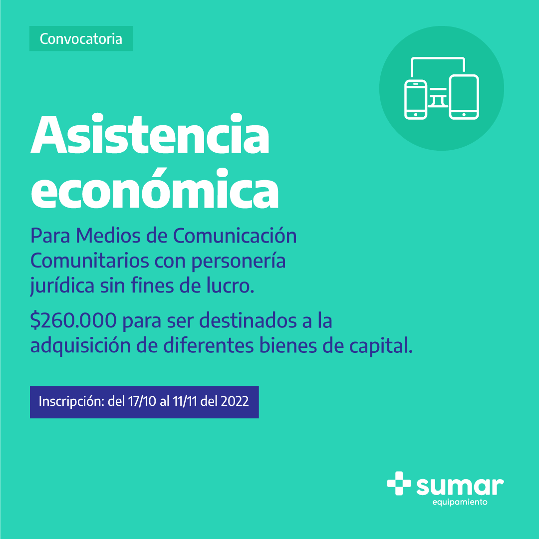 La Secretaría de Medios y Comunicación Pública lanza la tercera edición del *SUMAR Equipamiento*, una asistencia económica de $260.000.- destinada a Medios de Comunicación Comunitarios con Personería Jurídica sin fines de lucro, para la adquisición de equipamiento.