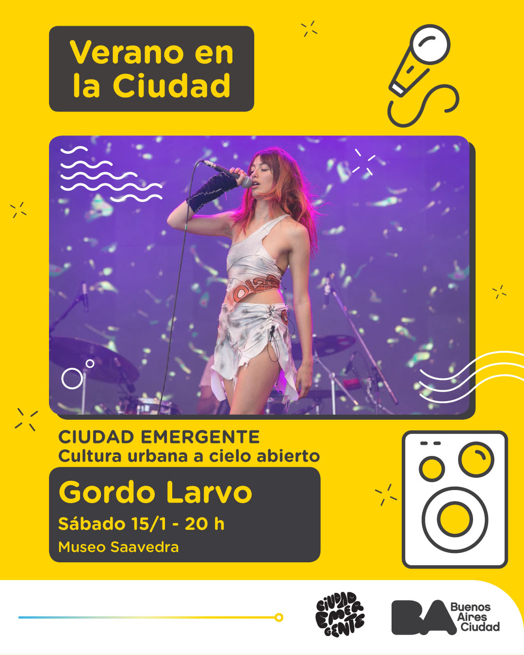 En el marco del festival #CiudadEmergente y el ciclo “Cultura urbana a cielo abierto”, se presenta “Gordo Larvo”, un proyecto musical de Hip Hop fusión compuesto por seis integrantes, que mezcla los sonidos distintivos del trap, neosoul, house, pop, rock y otros géneros musicales que en conjunto crean un sonido único y original.