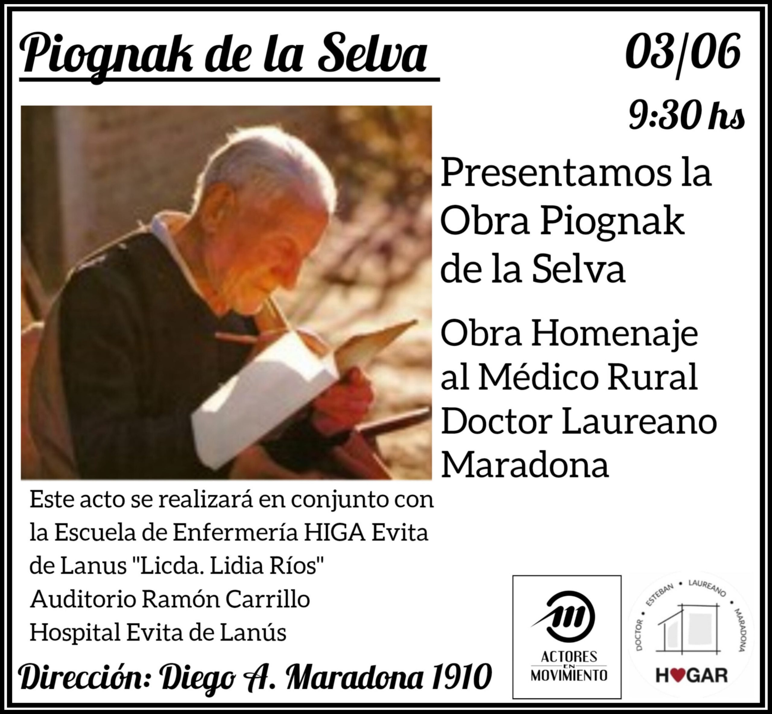 La compañía teatral Actrices y Actores en Movimiento presenta «Piognak de la selva», una obra que recorre la vida y obra del doctor Laureano Maradona, pionero de la medicina rural en Argentina. Con música en vivo, esta producción teatral destaca los valores de amor al prójimo y austeridad que Maradona predicó con su ejemplo.