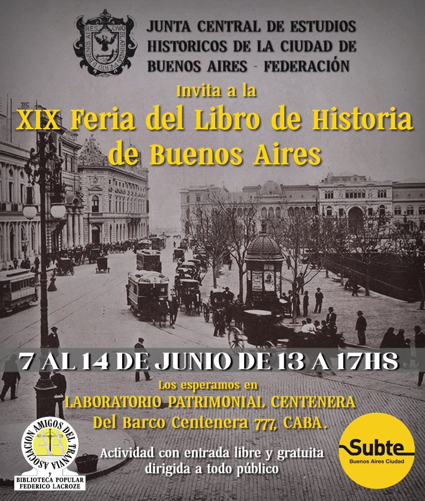 Desde el el 7 y hasta el día 14 de junio de 2025 se desarrollará a XIX Feria y Exposición del Libro de Historia del Buenos Aires organizada por Junta Central de Estudios Históricos de la Ciudad de Buenos Aires – Federación Asociación civil sin fines de lucro –. La inauguración del encuentro se desarrollará el 7 de junio a partir de las 13:00 horas en Del Barco Centenera 777 – Ciudad Autónoma de Buenos Aires -. La Feria y Exposición del Libro de Historia del Buenos Aires se realiza anualmente desde el año 2007 de modo consecutivo como encuentro de estudio, investigación y camaradería con el objeto principal de propender a la difusión de la historia ciudadana en particular y de la región metropolitana.